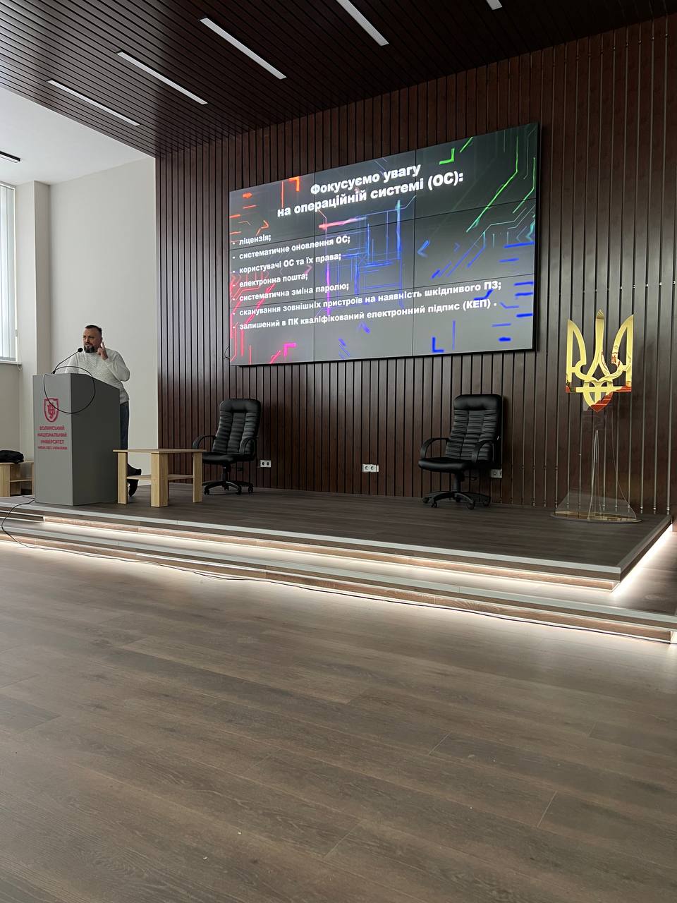 Під час зустрічі студенти отримали практичні знання про сучасні загрози у сфері кібербезпеки та методи їх запобігання. Лектор розповів про основні принципи захисту персональних даних, особливості створення надійних паролів, безпечне користування інтернет-ресурсами та засоби протидії кібератакам.