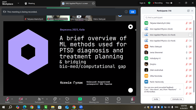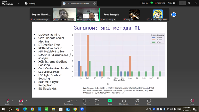 Під час заходу молодший науковий співробітник ЛДДМН Гулак Ксенія Леонідівна представила доповідь «Короткий огляд методів ML, що використовуються для діагностики та планування лікування ПТСР». У своїй презентації дослідниця окреслила сучасні підходи до використання машинного навчання для діагностики посттравматичного стресового розладу, а також методи моделювання та прогнозування ефективності різних планів лікування, що сприяють покращенню процесу одужання пацієнтів.