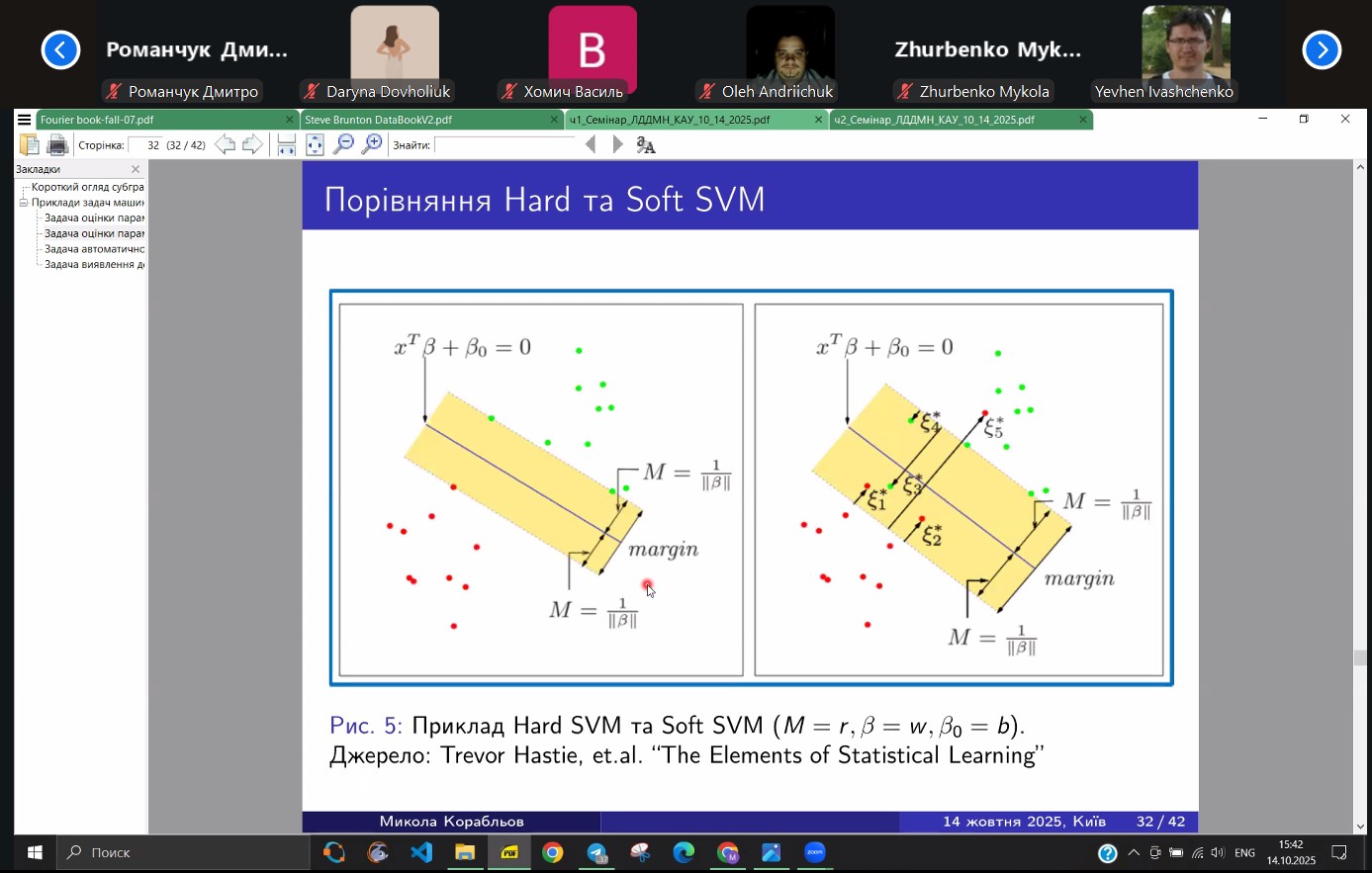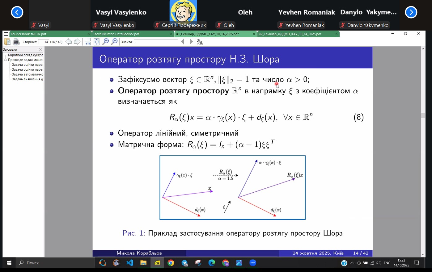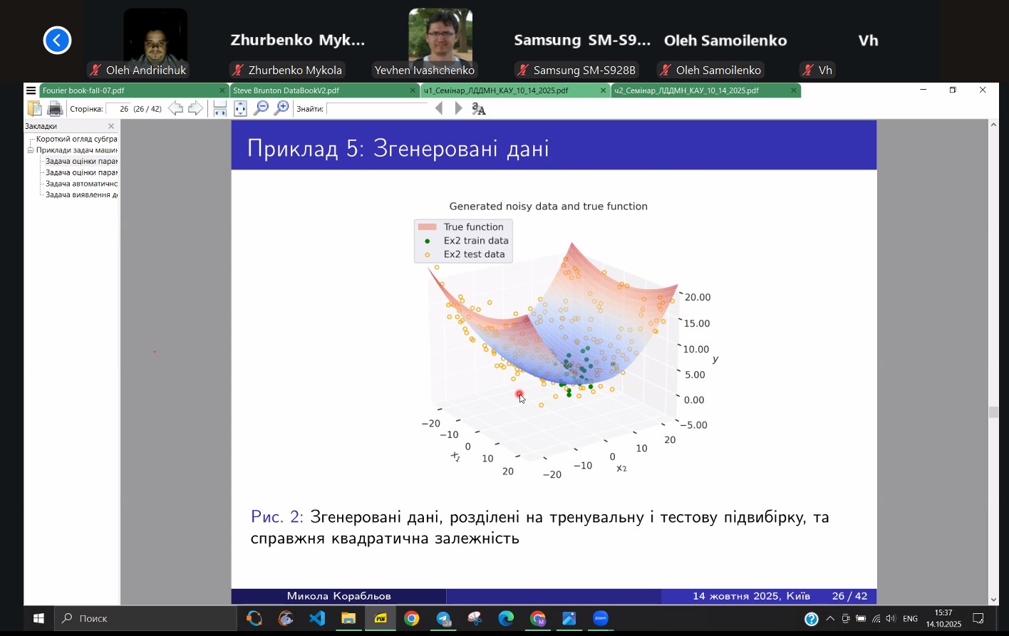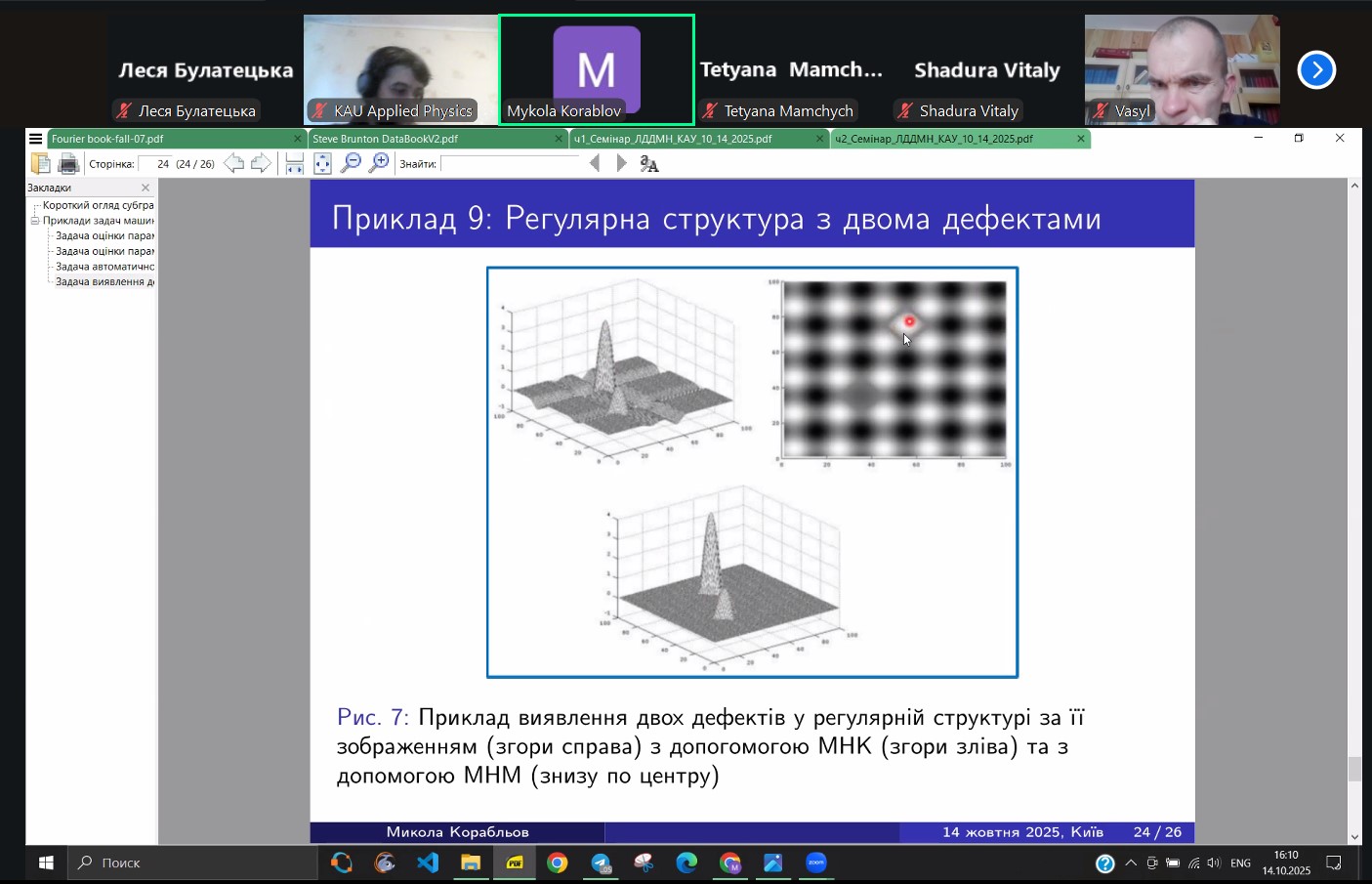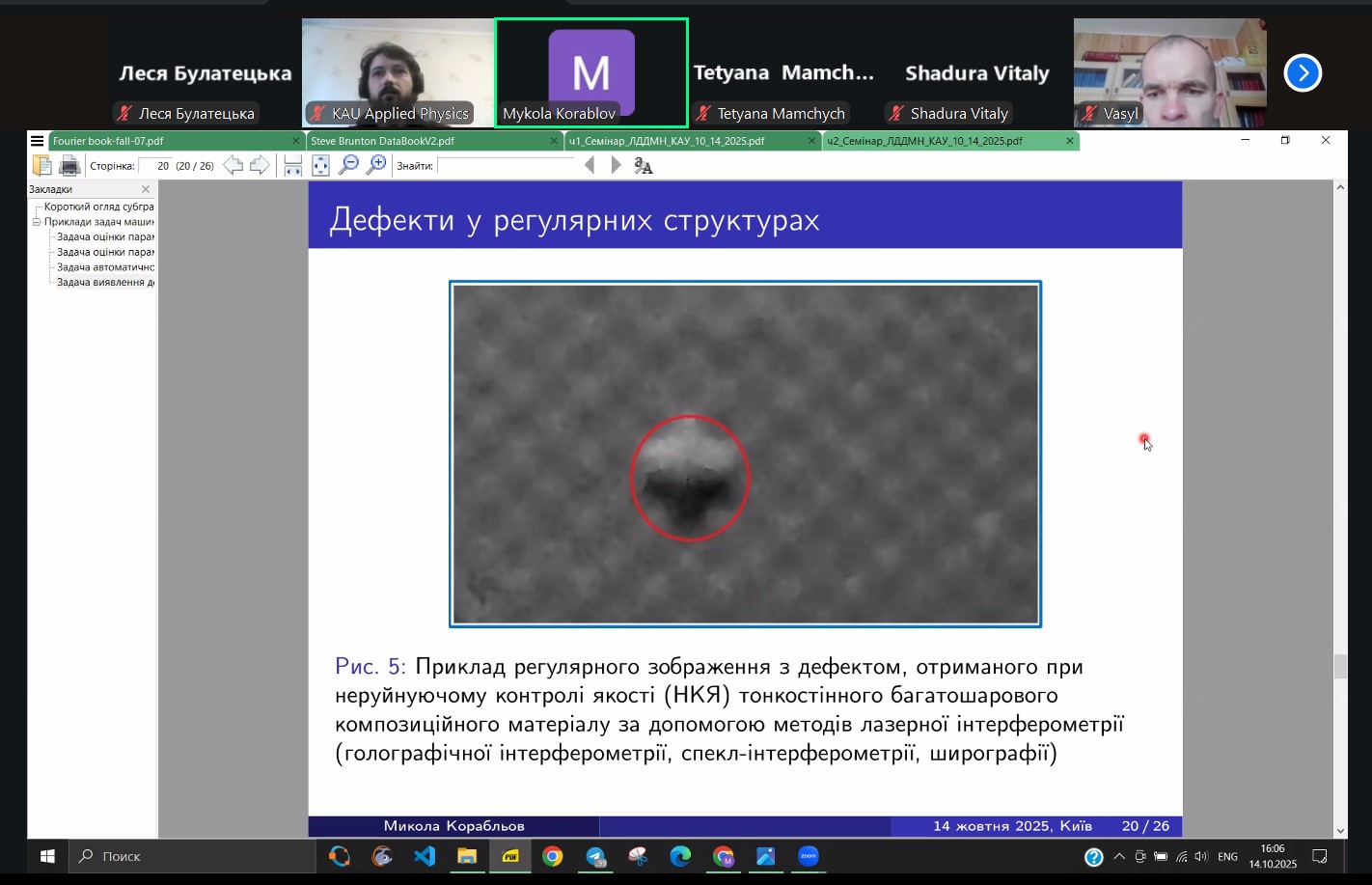 З доповіддю виступив Корабльов Микола Миколайович, аспірант Інституту кібернетики ім. В.М. Глушкова НАН України. Ключові теми семінару включали субградієнтні методи оптимізації. Доповідач детально розглянув поняття субградієнта як узагальнення класичного градієнта для опуклих недиференційовних функцій. Була проаналізована ідейна відмінність найпростішого субградієнтного методу від класичного методу градієнтного спуску. Описувалася загальна схема прискорення методів, заснована на перетворенні простору змінних. Серед розглянутих прикладів були метод еліпсоїдів та r-алгоритм Шора. Учасники семінару ознайомилися із практичним застосуванням в ML, зокрема з прикладами використання субградієнтних методів для розв’язання задач машинного навчання (як з учителем, так і без) у постановках із негладкими цільовими функціями. Окрему увагу було приділено виявленню дефектів, а саме задачі виявлення дефектів у регулярних структурах за їх зображеннями та порівнянню ефективності розв’язання цієї задачі за допомогою методу найменших квадратів і методу найменших модулів.