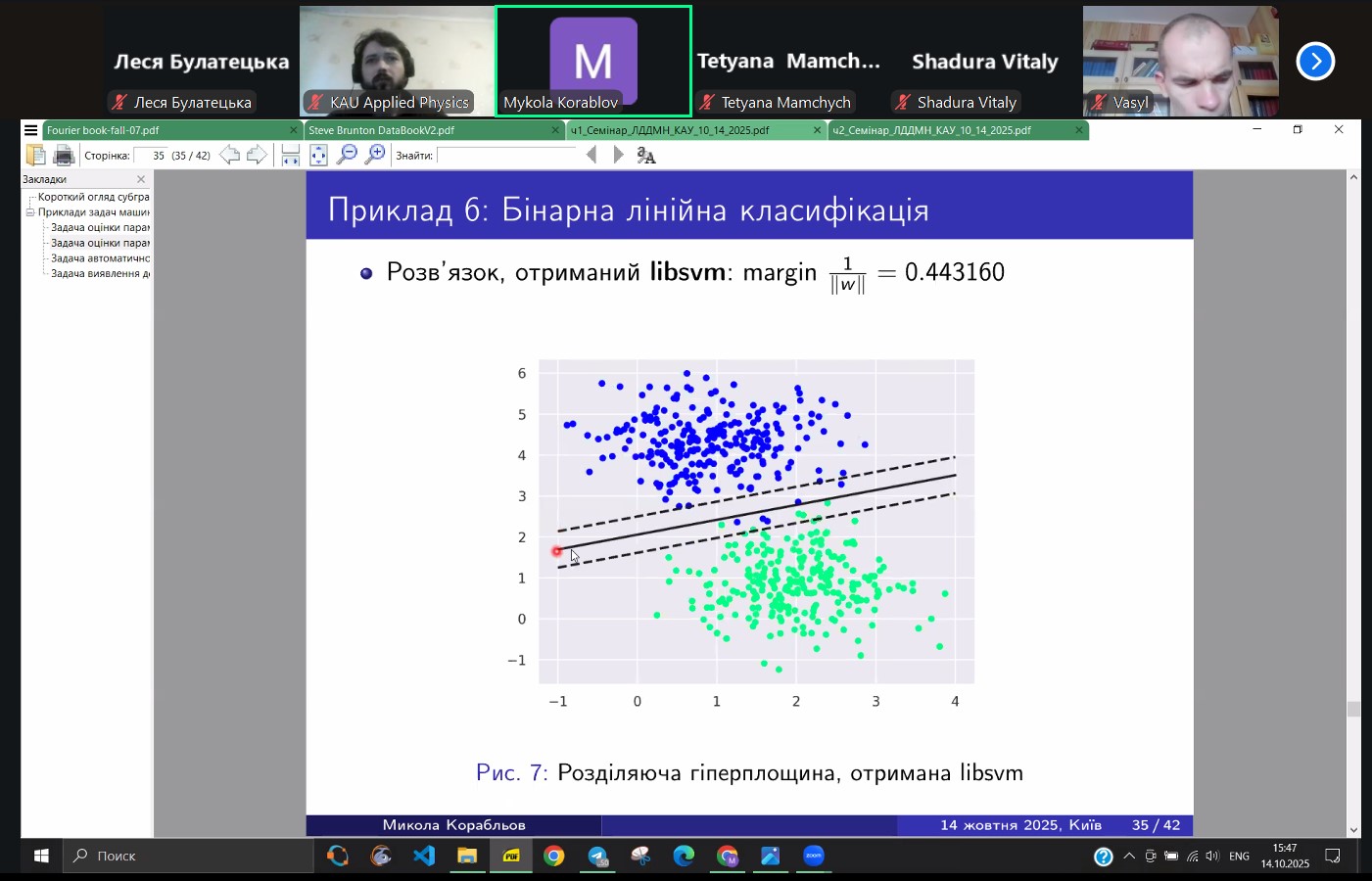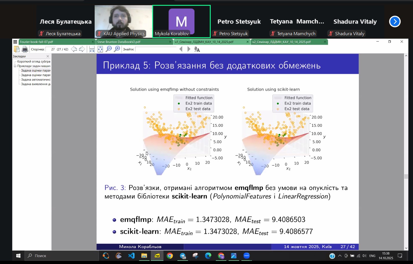 14 жовтня 2025 року, у форматі онлайн, здобувачі освітньої програми «Комп’ютерні науки та інформаційні технології» першого (бакалаврського) та другого (магістерського) рівнів вищої освіти за освітніми компонентами «Штучний інтелект» та «Сучасні методи та моделі обробки даних», а також члени проблемної групи «Методи штучного інтелекту» (викладач — Тетяна Мамчич) відвідали робочий семінар Лабораторії дослідження даних та машинного навчання, організований Київським Академічним університетом (КАУ). Захід був присвячений «Методам негладкої оптимізації для задач машинного навчання».