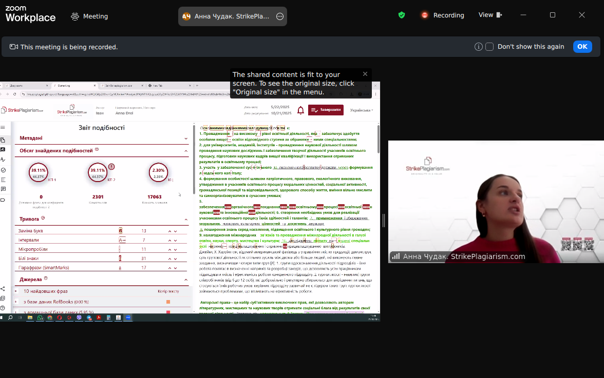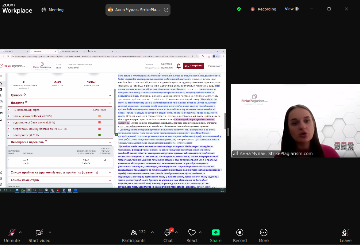 Спікерка — Анна Чудак, менеджерка з розвитку бізнесу StrikePlagiarism.com, — представила Звіт подібності, ознайомила учасників із можливостями модуля виявлення використання Штучного інтелекту, а також розповіла про сучасні технологічні інструменти, які допомагають забезпечувати прозорість і чесність у наукових та навчальних роботах.
