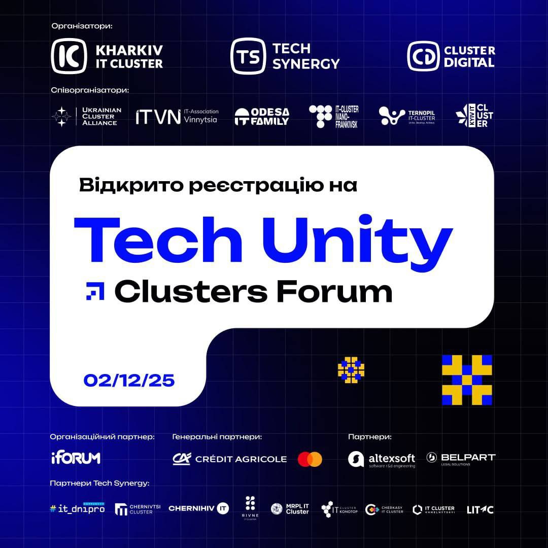 Запрошуємо адміністрацію, викладачів і студентів долучитися до Tech Unity: Clusters Forum 2025 — першого й відтепер щорічного форуму, що об’єднає всі ІТ-кластери України. технологічний бізнес, державу та освіту на одному майданчику.