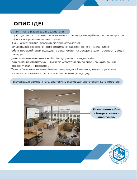 Окрема увага приділяється екологічності. «ЕКО-РЕСУРС» включає впровадження системи роздільного збору відходів, що сприятиме формуванню екологічно відповідальної поведінки та покращенню культури сталого споживання в університетській спільноті.