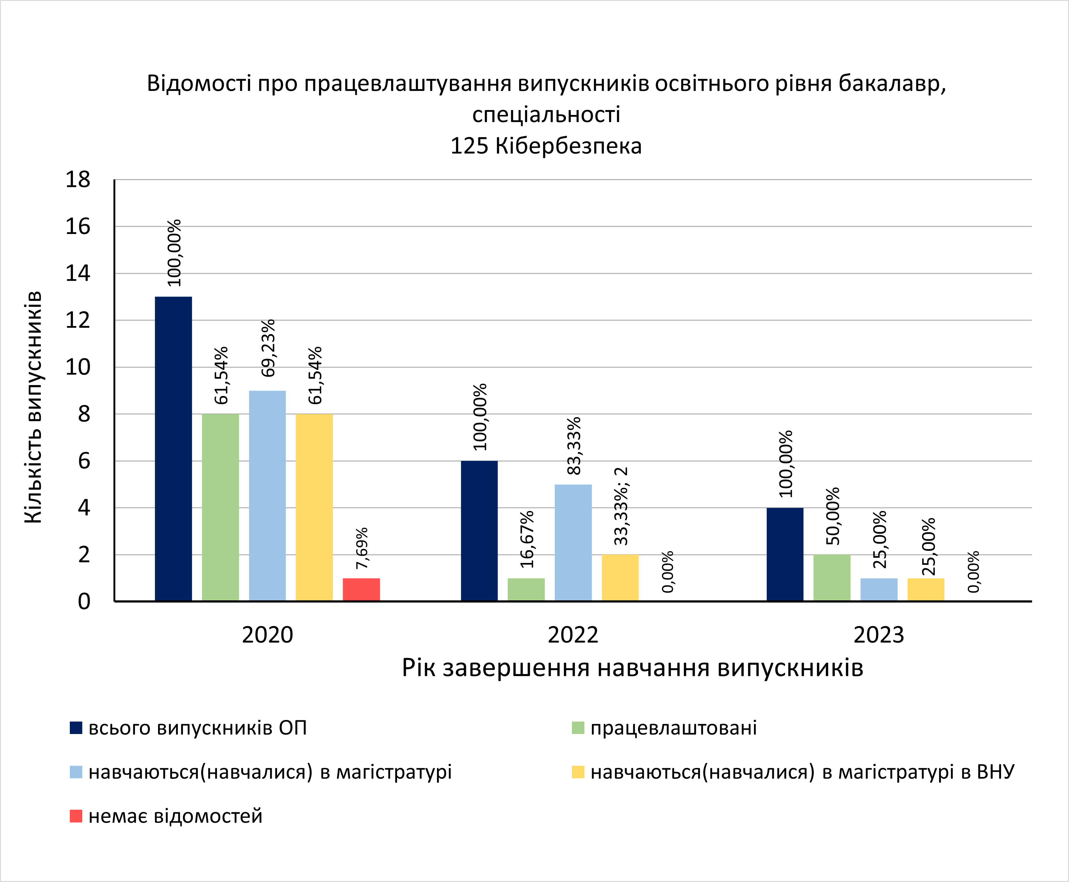 Випускники освітнього рівня “бакалавр” спеціальності 125 Кібербезпека 2020, 2022 та 2023 років випуску працевлаштовані на 61,54%, 16,67%, 50% відповідно. За спеціальністю працевлаштовані 2 випускники 2023 р. випуску. Малий відсоток працевлаштованих випускників обумовлений тим, що більшість з них продовжили навчання за магістерською програмою. Навчання за магістерськими програмами у 2020 р. продовжили 69,23% випускників, у 2022 р. – 83,33%, 2023 р. –25%.