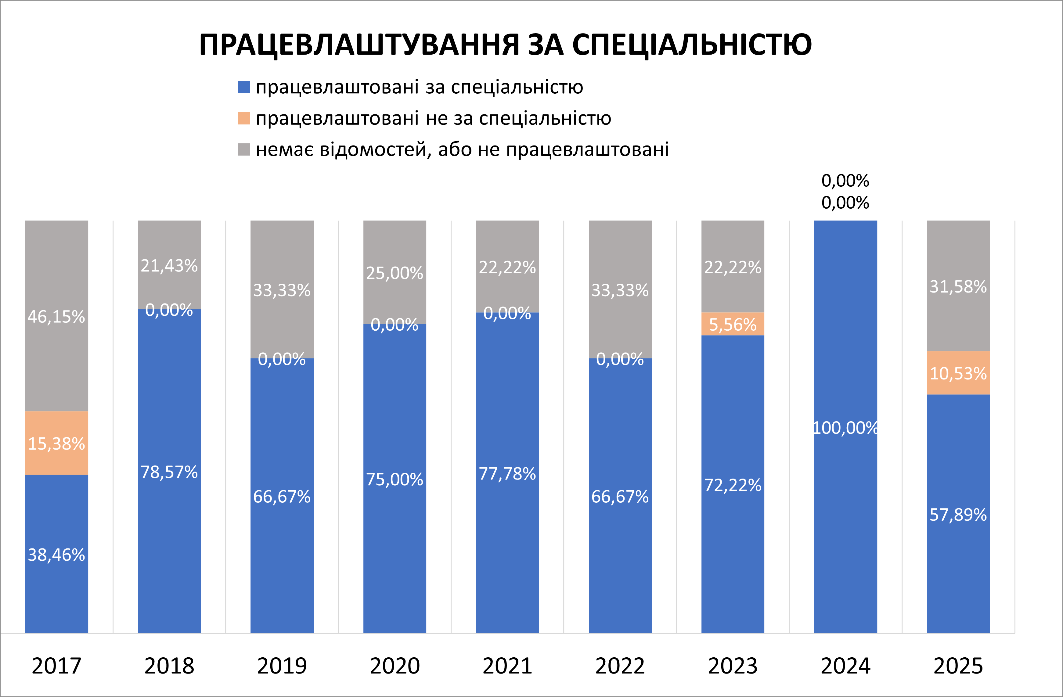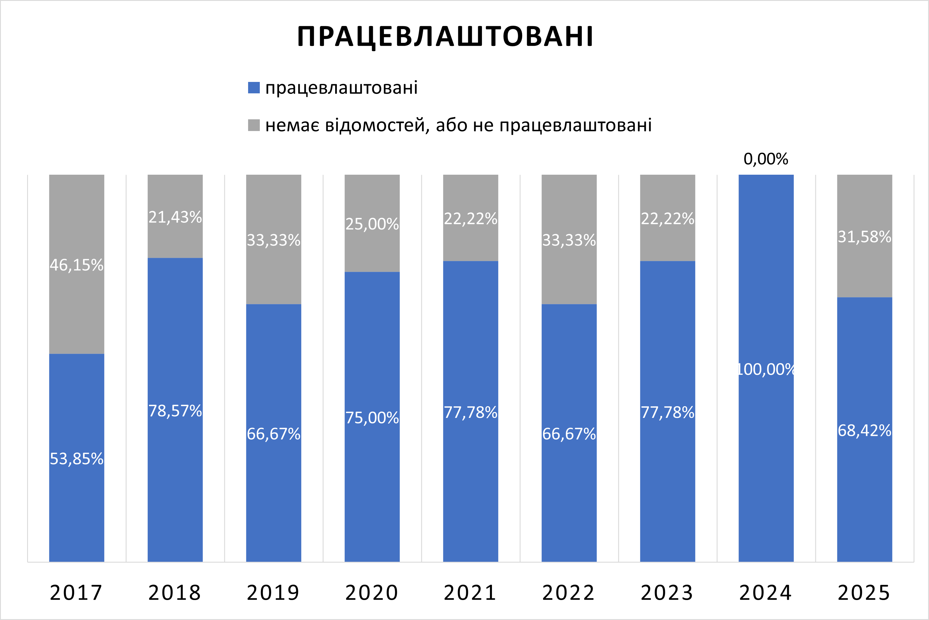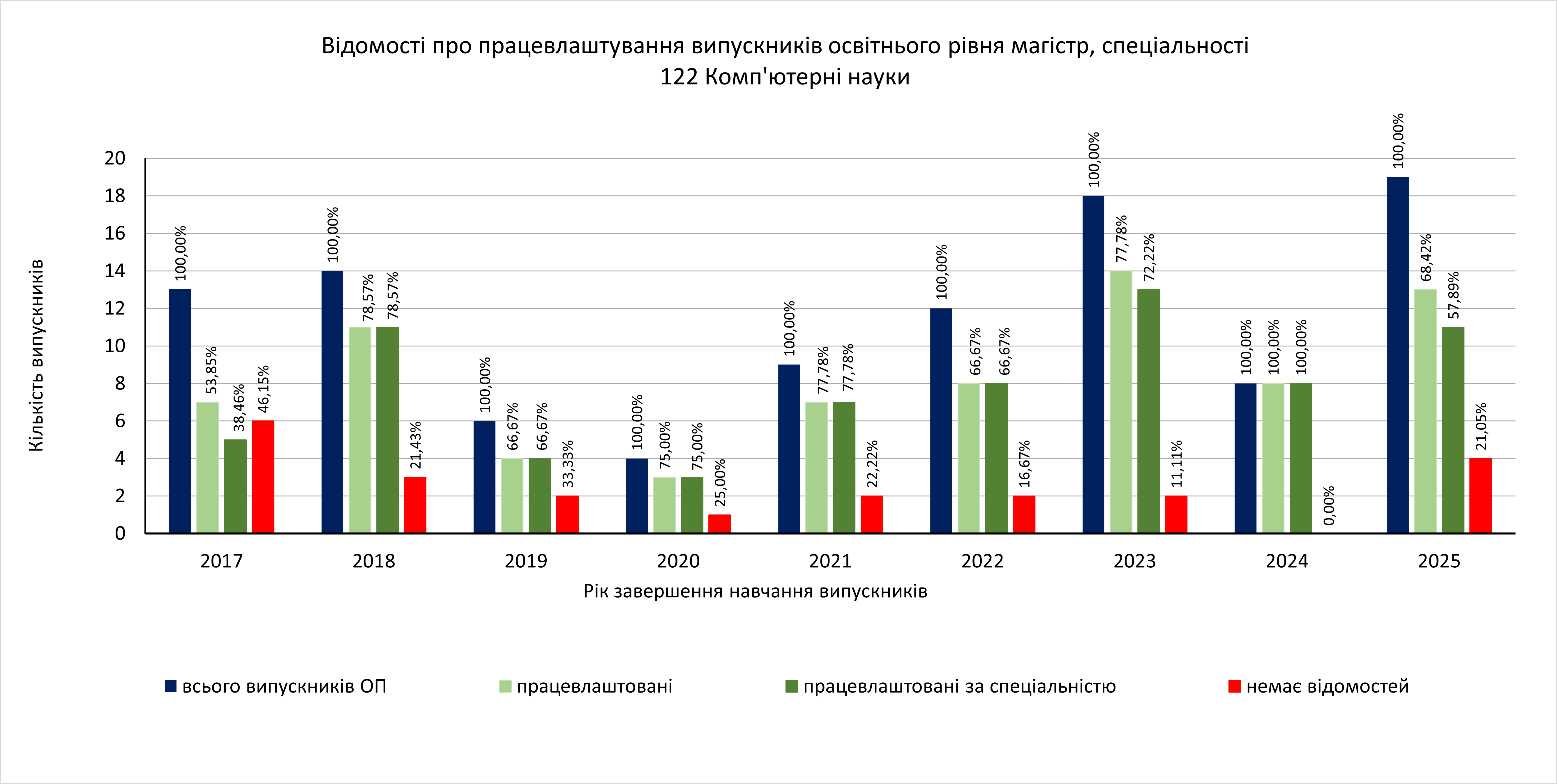 Випускники освітнього рівня “магістр” спеціальності 122 Комп’ютерні науки 2017, 2018, 2019, 2020, 2021, 2022, 2023, 2024 та 2025 років випуску працевлаштовані на 53,85%, 78,57%, 66,67%, 75%, 77, 78%, 66,67%, 77,78%, 100% та 68,42% відповідно. Майже всі працевлаштовані випускники працюють за спеціальністю.