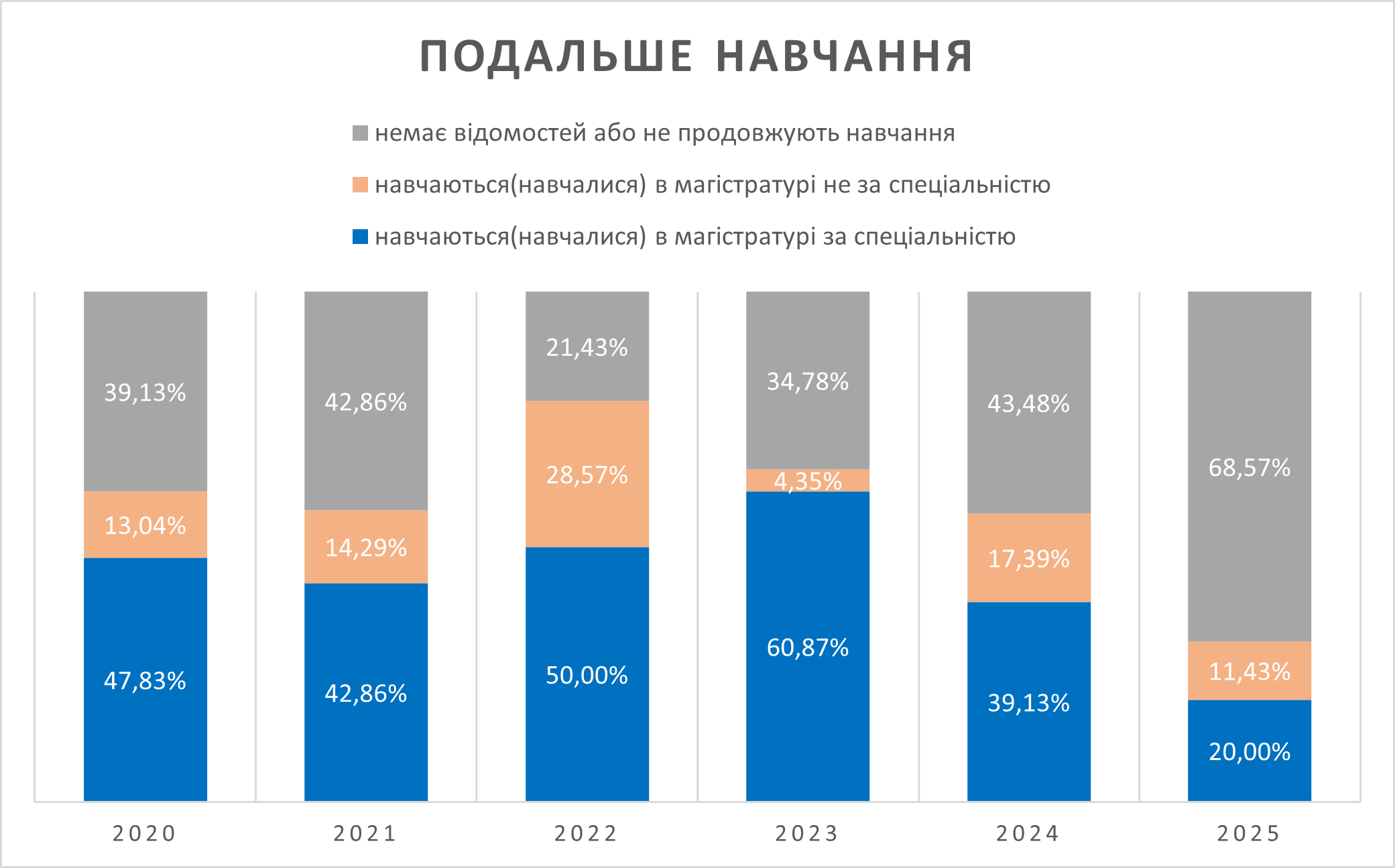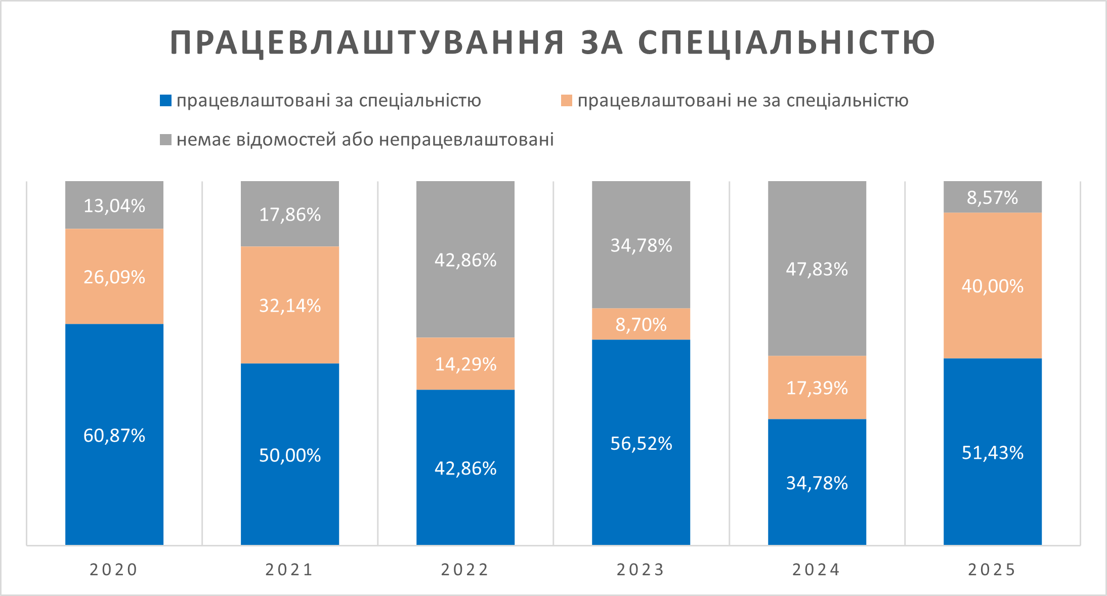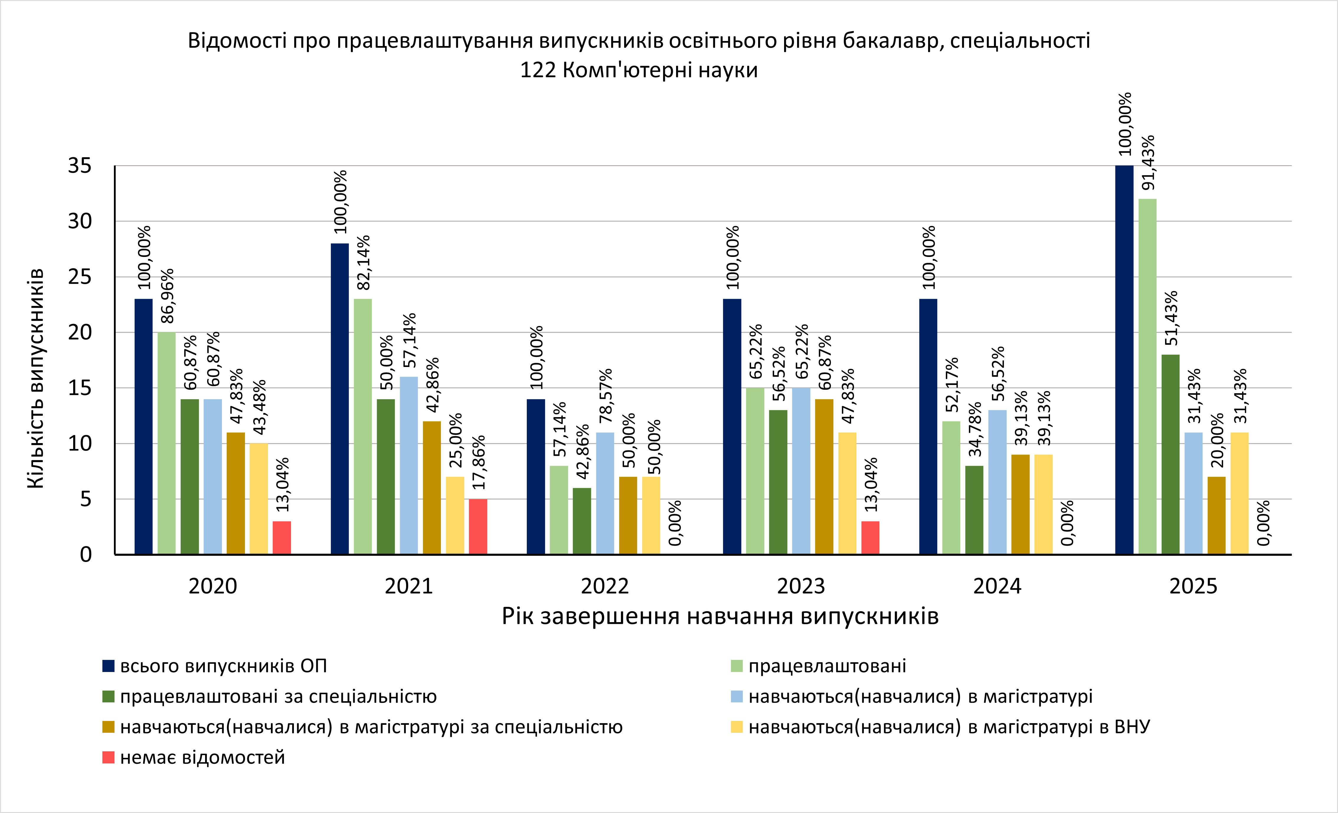 Випускники освітнього рівня “бакалавр” спеціальності 122 Комп’ютерні науки 2020, 2021, 2022, 2023, 2024 та 2025 років випуску працевлаштовані на 86,96%, 82,14%, 57,14%, 65,22%, 52,17% та 91,43% відповідно. За спеціальністю працевлаштовані 60,87% випускників 2020 р. випуску, 50% випускників 2021 р. випуску, 42,86% випускників 2022 р. 56,52% випускників 2023 р. випуску, 34,78% випускників 2024 р. випуску, 51,43% випускників 2025 р. випуску. Менший відсоток працевлаштованих випускників 2022 – 2025 р. обумовлений тим, що більшість з них продовжили навчання за магістерською програмою. Навчання за магістерськими програмами у 2020 р. продовжили 60,87% випускників, у 2021 р. – 57,14%, у 2022 р. – 78,57%, 2023 р. –62,22%, 2024 р. – 56,52%, 2025 р. – 31,43%. У Волинському національному університеті імені Лесі Українки на магістерській освітній програмі “Комп’ютерні науки та інформаційні технології” у 2020 р. продовжили навчання 43,48 %, у 2021 р. – 25%, у 2022 р. – 50 % , у 2023 р. – 47,83 %, 2024 р. – 39,13 %, 2025 р. – 20 % випускників.